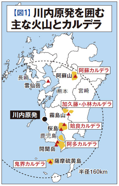 火山学者の唱える科学的知見に目をつぶっているのは、何も「山が好きな人たち」ばかりではない。九州電力・川内(せんだい)原発1、2号機の再稼働をめぐる原子力規制委員会の安全審査では、火山のことが俎上(そじょう)に載せられた。原発の規制基準では半径160キロメートル圏内にある火山を検討の対象にしており、川内原発の場合、その対象となる火山が39もあり、過去に巨大噴火を起こした5つのカルデラ火山まである(【図1】)。